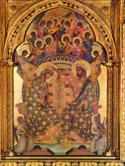 Scéna na ústředním panelu měla pro řeholnice symbolický význam, neboť Panna Marie se po svém nanebevzetí a korunovaci Královnou Nebes stala Kristovou mystickou nevěstou a stejně tak budoucí řádové sestry při svém vstupu přísahaly, že se stanou Kristovými nevěstami. V dnes již neexistujícím kostele se klarisky účastnily mše na tribuně, aby tak byly odděleny od laiků v přízemí lodi.