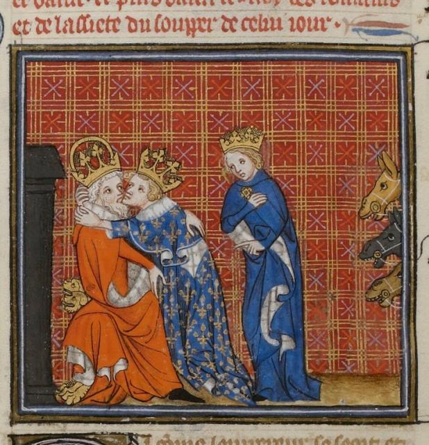 K císaři se naklání jeho synovec, francouzský král Karel V., který jej vítá „polibkem míru“. Francouzský panovník má na hlavě královskou korunu a je oděn v kožešinou podšitý plášť v barvě královské modře. Ten je pak posetý četnými vyšívanými zlatými liliemi. Králova tvář je dle tehdejší francouzské módy bezvousá.