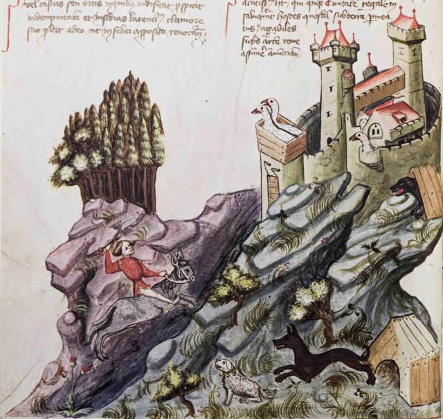 Komicky a zároveň záhadně působí vyobrazení, které najdeme na foliu 85v. Co vlastně vidíme? Máme před sebou jednu z výše zmíněných „krajinomaleb“. K opevněnému hradu na skále míří jezdec, jenž bičíkem pohání svého „oře“, tedy podle barvy, tvaru hlavy a uší spíše osla. Již samotný bosý jezdec v módním kabátci působí docela komicky a hlavně nepatřičně. Pomineme-li docela bohatou flóru (stromy, květiny, trávu), zaujmou nás hned tři psi různých plemen, kteří pozorují blížícího se jezdce. Nejmenší z nich, kterého jezdec nechává zcela v klidu, má nádherný obojek „zdobený“ rolničkami, které sloužily mimo jiné i k tomu, aby měl „psovod“ přehled, kde se jeho pes právě nachází.