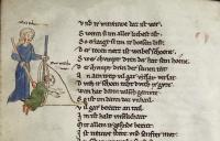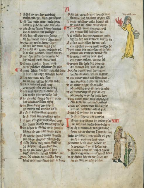 Vraťme se však k nejstaršímu, heidelberskému rukopisu. Na foliu 16v zaujme obrazový doprovod veršů 1003–1022, které začínají slovy „Der toren netze ist wibes schoene“. Co vlastně vidíme? Máme před sebou krásnou ženu, jak dokazuje i nápis „Das schone wip“. Jedná se o ženu svobodnou, protože její plavé vlasy nejsou zakryté. V pravé ruce drží dlouhou, zřejmě „dřevěnou“ lžíci, kterou postrkuje pošetilého, „láskou opilého“ muže („Der torsche man“), kterého předtím pobláznila svou krásou. Chytá jej do předem připravené sítě.