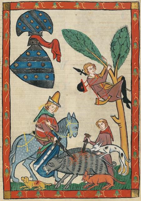 V Codexu Manesse vidíme lovce na koni, jenž uštědřuje zvířeti, na které se vrhli lovečtí psi, ránu mečem. „Obrněné“ zvíře s výrazným „štětinatým hřebenem“ na zádech musí čelit přesile. Dva psi se do něj zakousli, vlevo na zemi je pak zraněný malý brakýř. Za kancem stojí lovcův pomocník, který mu do hřbetu zabodává dýku. Teprve nyní se dostáváme k tomu komickému. Na iluminaci je vyobrazen totiž ještě jeden pomocník, vybavený kopím a lesním rohem. Klidně bychom mohli říci, že původně vylezl na strom, aby se podíval, zda někde nevidí lovené zvíře. Skutečnost je však zcela jiná. Ze strachu se před nebezpečným lesním tvorem uchýlil na strom, aby si zachránil vlastní život. Výmluvný je pak i výraz jeho tváře, kterou zdobí zřetelný úsměv. Má radost, že se zachránil. Iluminátor se tak pokusil celou loveckou scénu „odlehčit“, což se mu „zachráněným“ lovcem na stromě opravdu povedlo.
