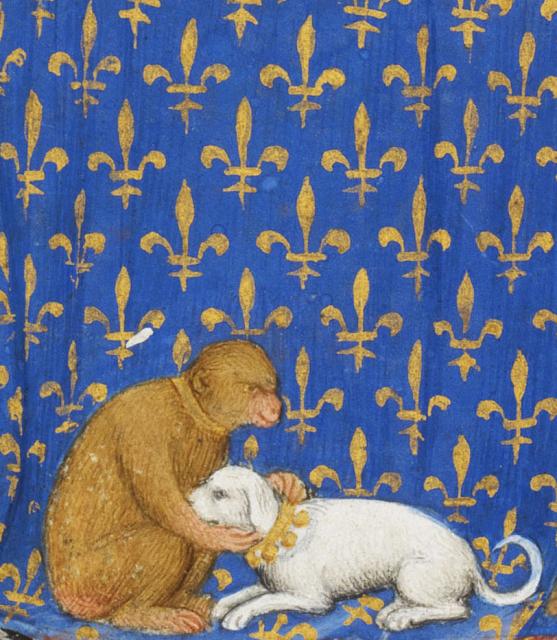 Je možné, že toto zobrazení musíme „číst“ zcela jinak. Pejsek s obojkem bohatě zdobeným rolničkami zde zřejmě symbolizuje nejen oblíbeného domácího mazlíčka, ale také samotného krále, kterého utěšuje vedle něj sedící opice s prostým obojkem kolem krku. Právě obyčejnost opičího obojku ukazuje, že se sice jedná o ochočeného domácího miláčka, ale jeho role není tak důležitá jako u bílého pejska. Pejsek navíc působí podobně jako francouzský král Karel VI. smutně, a možná právě proto jej opice drží kolem krku a snaží se jej utěšit. Opice zde stejně jako na mnoha jiných středověkých vyobrazeních přejímá, příp. napodobňuje lidské chování. Většinou však vůbec neví, proč tak činí.