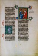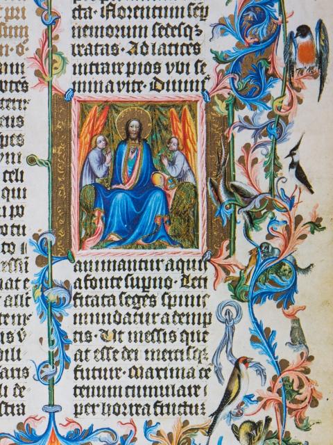 Nejznámější a zároveň nejkrásnější ze všech iluminací rukopisu je výzdoba titulního listu, který patří vůbec k tomu nejlepšímu, co můžeme v dochovaných rukopisech Václava IV. objevit. Jedinou orámovanou iniciálu titulního listu (O) zdobí modrá točenice na zlatém damaskovaném pozadí. Hlavní miniatura titulního listu pak představuje Krista v modrém plášti sedícího na zeleném trůnu. Kristova levice drží zeměkouli v barvách duhy, pravici pozvedá v poučném gestu. Po stranách Krista stojí vždy anděl, jeden se modlí s roztaženýma, druhý se spojenýma rukama. Ze čtyř rohů rámu miniatury vyrůstají stylizované akantové listy. Proplétají se bohatými úponky, které pokrývají všechny čtyři okraje titulního listu. V nich se otevírá úžasný malý svět rostlin, zvířat a lidí.