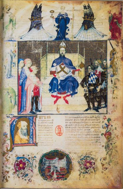 O tom, že rukopis patřil římskému a českému králi Václavu IV., svědčí výzdoba úvodní listu, na němž objevíme reprezentativní Lucemburkovo vyobrazení ve společnosti kurfiřtů. V dolní části listu je namalovaný čtvrcený znak uherského krále Matyáše Korvína. Pod tímto znakem byl ale původně namalovaný znak zcela jiný, jednohlavá orlice bez koruny s roztaženými křídly. Právě díky ní mohl být identifikován panovník vyobrazený na hlavní miniatuře.