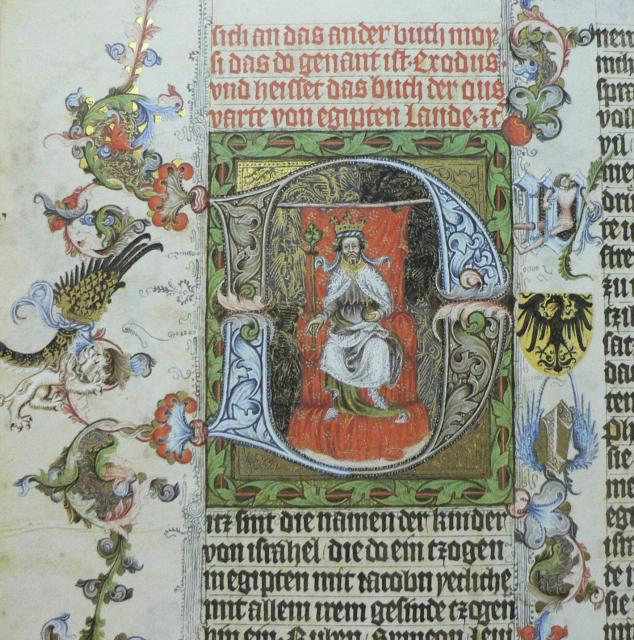 V prvním svazku tohoto mimořádného díla (Cod. 2759) objevíme na foliu 53v úvodní iniciálu knihy Exodus. Jejím autorem je Frana - František, jeden ze dvou iluminátorů Václavovy bible, jež známe jménem. V iniciále D, jež je zasazena do akantového rámu, je zobrazen král sedící na červenou látkou pokrytém trůnu. Na hlavě má korunu, kterou nelze blíže určit, ale při bližším ohledání je viditelná kamara. Pod korunou je pak dobře rozeznatelná točenice, jejíž cípy volně vlají vedle panovníkovy hlavy. V pravé ruce drží žezlo, v levici pak říšské jablko. Panovník je zahalen v bohatě vzorovaný plášť se stojatým límcem.