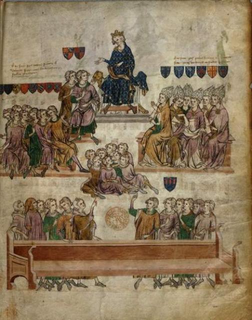 Titulní iluminace zachycuje „politickou společnost“ Francie za vlády krále Filipa VI. z rodu Valois. Nejvýše posazeným je francouzský král s královskou korunou na hlavě a v modrém plášti posetém zlatými liliemi. Gesto pravé ruky i pohled míří k dvěma postavám, které jsou nadřazeny pairům a církevním hodnostářům, kteří jsou vyobrazeni zase o „stupínek“ níže.