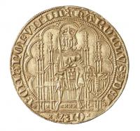 Zcela mimořádné postavení mezi Karlovými zlatými mincemi zaujímá „écu d’or“ (zlatý štít). Mince o průměru téměř 3 cm a váze kolem 4,5 g vychází z nejstarších francouzských zlatých mincí, které byly raženy již od 12. století. Stejně jako florény, tak i tyto peníze byly hojně napodobovány. Inspirovat se nechal i římský císař a český král Karel IV., který nechal tyto mince razit po roce 1355 pravděpodobně v Antverpách. Na přelomu let 1356 a 1357 je pak nechal rozhazovat do davu během proslulého říšského sněmu v Metách, kde bylo slavnostně vyhlášeno konečné znění nového říšského zákoníku, později nazvaného Zlatá bula. Ze strany panovníka to bylo především gesto štědrosti.