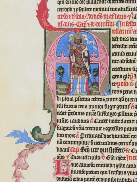 Z hlediska panovnické ikonografie jsou zajímavé dvě iniciály s vypodobněním sv. Václava. Známější iniciálu A(dest) najdeme na foliu 268v. Svatý Václav je zobrazen jako rytíř, což bylo světcovo pojetí, které se ve větší míře začalo objevovat od 13. století. V skalnaté krajině s dvěma stromy stojí rytíř. Rytíř a světec je oblečen v šupinatou zbroj byzantského původu. Zpod zbroje je vidět drátěná košile. Václav je přepásán mečem, v pravé ruce drží korouhev se svatováclavskou orlicí, v levici tříme štít se stejným erbovním znamením. Přes ramena má přehozený kožešinou podšitý plášť, který sahá až na zem. Jeho tvář zdobí vousy na hlavě má knížecí čapku, kolem hlavy svatozář. Podobné vypodobnění můžeme najít kupř. na pečeti Karlovy univerzity.