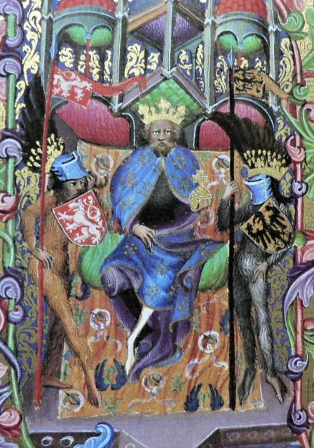 Na iluminaci vidíme trůnícího staršího vousatého panovníka s královskou korunou na hlavě a královským jablkem v levé ruce. Pravou si přidržuje modrý, zlatem prošívaný plášť, do něhož je částečně zahalen. Je oděn podle dobové módy, o čemž svědčí především špičaté zakončení jeho obuvi a dvoubarevné nohavice.