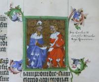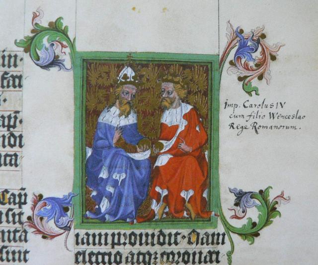 Císařův plášť je jako na sedmnácti jiných miniaturách - a také jako plášť Kristův a Boha otce - tmavě modrý. Mladší muž má na hlavě „pouze" královskou korunu, v pravici drží říšské jablko, levačkou pak komunikuje se svým spolusedícím. Zářivě červená je barvou pláště mladého krále, kterým není nikdo jiný než český a římsko-německý král Václav IV. Císařem sedícím po jeho pravici je pak jeho otec Karel IV. „Důkazem" je mimo jiné i na okraji napsaná vysvětlivka pocházející ale až z druhé poloviny 17. století: Imperator Carolus IV cum filio Wenceslao Rege Romanorum.