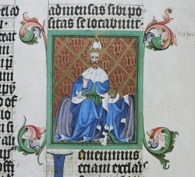 Miniatura ukazuje císaře na trůně s korunou a říšským jablkem, ale bez žezla. Místo něj císař v modrém plášti bohatě zdobeném hermelínem pozvedá pravici v poučném gestu stejně jako Kristus na titulním listu. Damaskované pozadí miniatury opakuje asi desetkrát písmeno W. Nejedná se tedy o zobrazení císaře Karla IV., ale o reprezentativní vypodobnění jeho syna Václava IV. jako zamýšleného budoucího císaře.