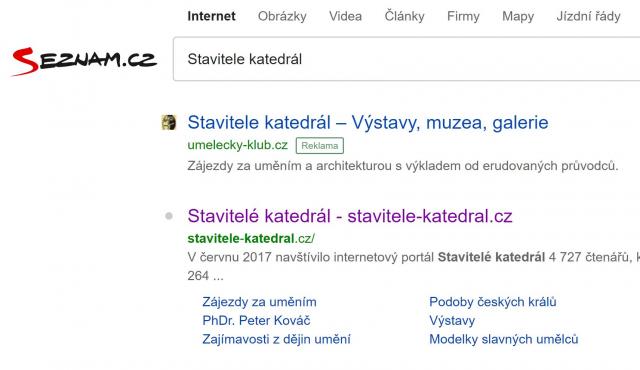 Poslední touto akcí je zaplacení si reklamy na internetovém portálu Seznam, kdy pod názvem STAVITELE KATEDRÁL – Výstavy, muzea, galerie se skrývají komerční stránky cestovní kanceláře Umělecký klub s. r. o. (viz obr.).