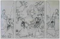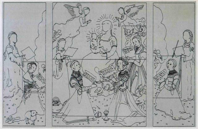 Pravděpodobná kresebná rekonstrukce Cranachova Pražského oltáře, jak ji udělal německý odborník Hans Georg Thümmel. Uprostřed seděla Panna Marie obklopená osmi stojícími a klečícími světicemi. Na kresbě jsou naznačeny čtyři výřezy, které se po roce 1619 z původního celku zachovaly.