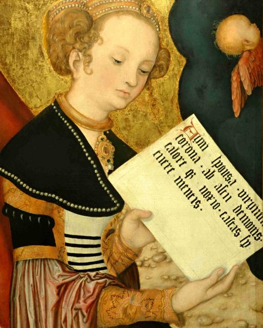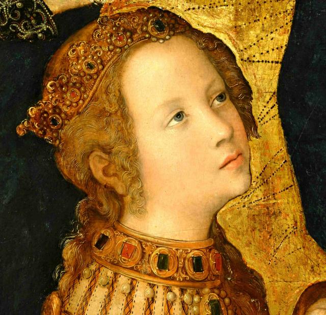 Je zvláštní, že Cranachovu malbu nezničili jako celek, ale nejprve z oltáře pečlivě pilou vyřízli pohledné tváře světic, které Pannu Marii na obraze obklopovaly. Tvrdilo se totiž, že modelkami pro tyto renesanční krásky byly dcery císaře Maxmiliána I., který údajně oltářní obraz pro pražskou katedrálu objednal a zaplatil.