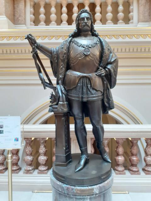 Foto Marek Zágora. Bronzová socha Jiřího z Poděbrad na podestě hlavního schodiště Historické budovy Národního muzea, jejímž autorem je Ludwig von Schwanthaler (1802–1848). Odlita byla v roce 1850.
