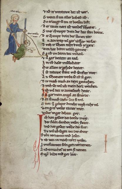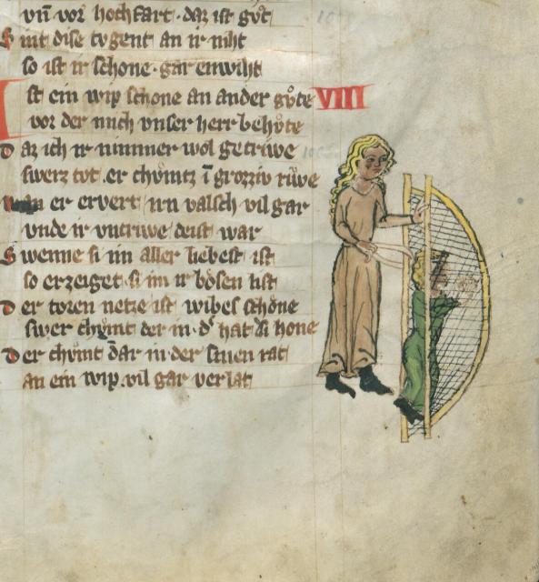 Vraťme se však k nejstaršímu, heidelberskému rukopisu. Na foliu 16v zaujme obrazový doprovod veršů 1003–1022, které začínají slovy „Der toren netze ist wibes schoene“. Co vlastně vidíme? Máme před sebou krásnou ženu, jak dokazuje i nápis „Das schone wip“. Jedná se o ženu svobodnou, protože její plavé vlasy nejsou zakryté. V pravé ruce drží dlouhou, zřejmě „dřevěnou“ lžíci, kterou postrkuje pošetilého, „láskou opilého“ muže („Der torsche man“), kterého předtím pobláznila svou krásou. Chytá jej do předem připravené sítě.