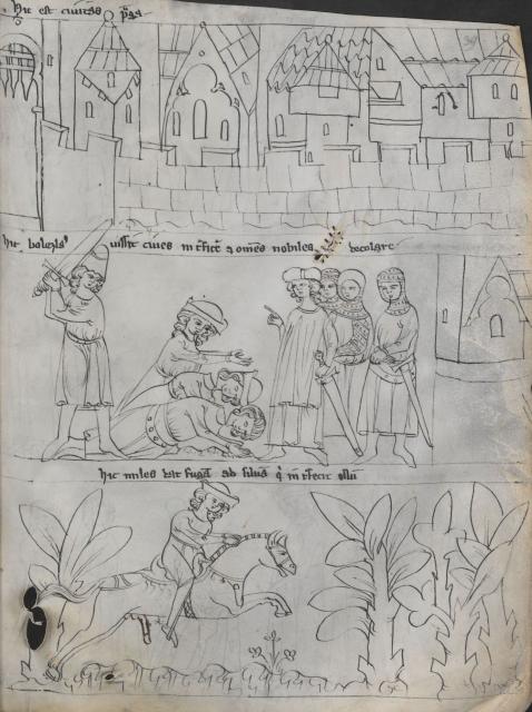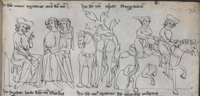 A právě s Podivenem je spjato i něco komického, co najdeme na předchozí straně, tedy na foliu 39r. Dole je zobrazen Podiven, jak na svém koni prchá směrem k lesu, který je naznačen kresbou tří stromů. To, co je na této scéně komického, ale nepochází z doby, kdy vznikl rukopis, nýbrž to bylo přikresleno až později. O co se jedná? Výše jsem uvedl, že se u koní nedá určit pohlaví. U Podivenova zvířete je tomu však jinak. Pozdější ruka totiž přikreslila jeho koni výrazný, dá se říci nepřehlednutelný pohlavní úd, takže máme před sebou ukázkového hřebce.
