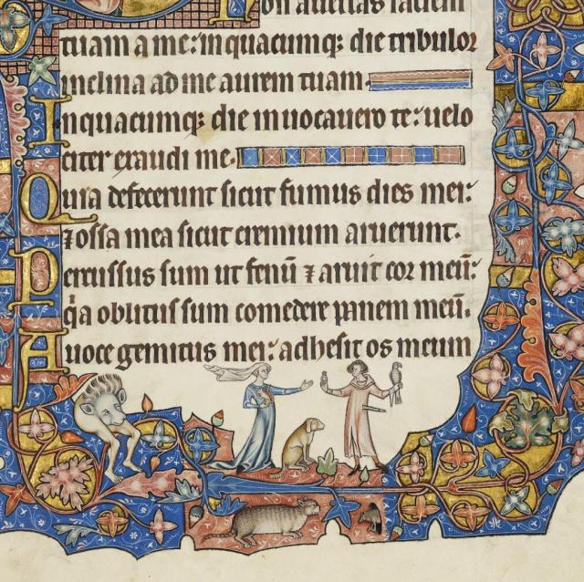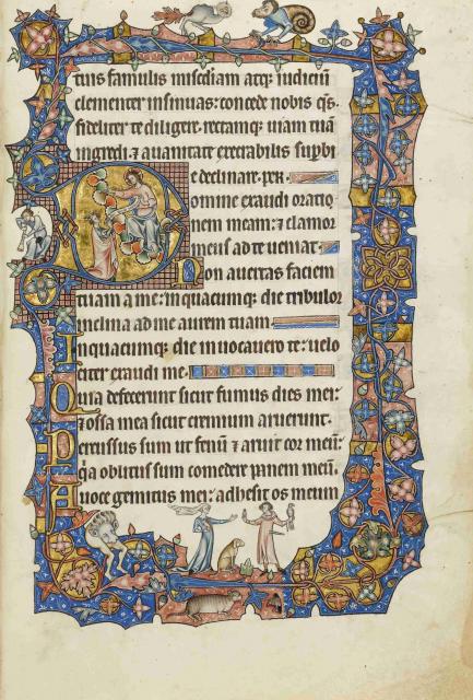 Podívejme se podrobněji na folio 131r, jemuž vévodí iniciála D žalmu 101 (102) s modlícím se králem Davidem, jenž klečí před Kristem sedícím na nebesích. Ten pozvedá pravou ruku, kterou žehná, a slibuje kladnou odpověď na Davidovu prosbu. Mezi Davidem a Kristem je dobře čitelná mluvící páska s úvodními slovy žalmu: „Hospodine, vyslyš mou modlitbu,…“. Vedle iniciály pak najdeme mladého hudebníka, jenž svou hrou doprovází text žalmu.