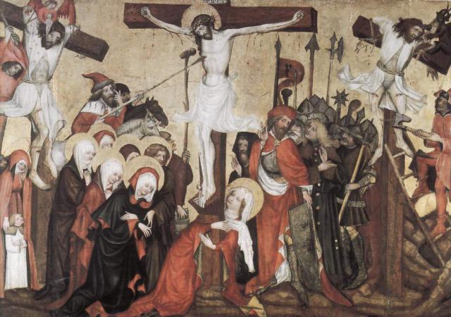 Na oltářním triptychu ze Zátoně je vyobrazen muž tmavší pleti s podbradkem a černými kníry, který se nachází na dolním obraze pravého křídla, ve scéně přinesení uťaté hlavy sv. Jana Křtitele před Heroda.(66) Na obraze Ukřižování ze Skalice pak nacházíme mezi žoldnéři vpravo postavu s obtloustlou tváří, lehce zahnutým nosem a černými kníry, která drží husitský cep a konvičku s Kristovou krví. Jedná se pravděpodobně opět o kritický kryptoportrét Jiřího z Poděbrad.(67) Oba obrazy pocházejí z panství Rožmberků. Velice dobře jsme zpraveni o nepřátelství mezi katolíkem Oldřichem z Rožmberka a mladým zastáncem husitství Jiřím z Poděbrad, proto se dá vysvětlit, proč se postava Jiřího nachází na straně Kristovým mučitelů. Na obraze Ukřižování z oltáře sv. Kříže(68) stojí po Kristově levici, tedy na straně jeho nepřátel, tři postavy, z nichž třetí, nejdále od kříže, nese v obličeji rysy Jiřího z Poděbrad.(69)
