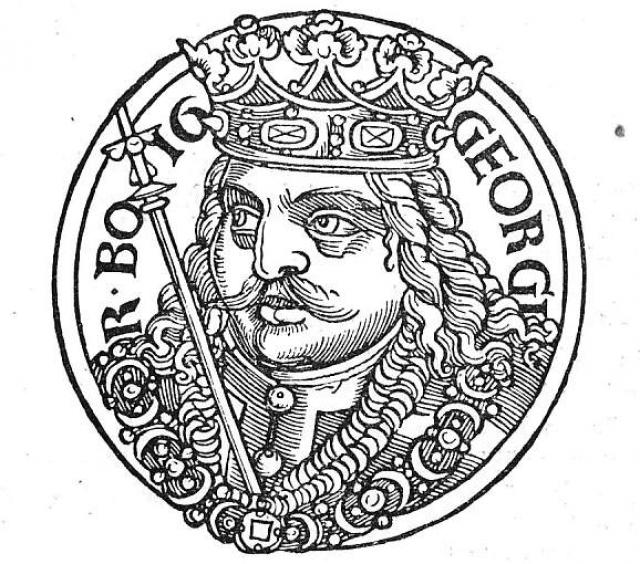 V Konáčově(39) překladu „České kroniky"(40) Enea Sylvia Piccolominiho z roku 1510 nacházíme fiktivní podobu krále Jiřího. Bezvousý panovník širokých tváří sedí na trůně a v levé ruce drží královskou korunu.(41)