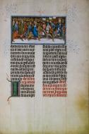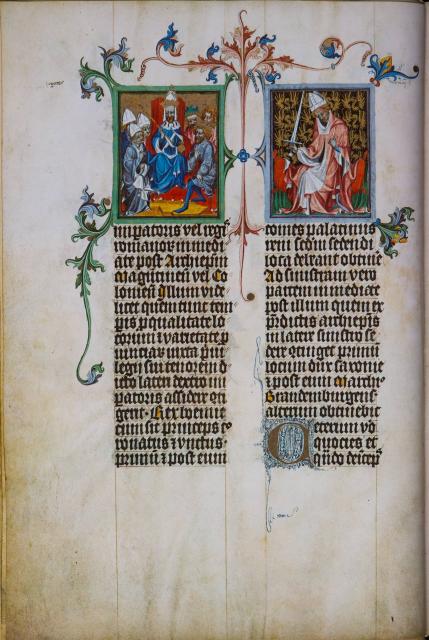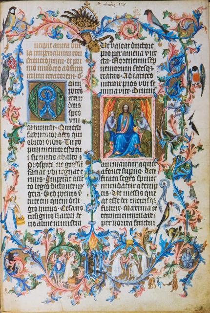 Nejznámější a zároveň nejkrásnější ze všech iluminací rukopisu je výzdoba titulního listu, který patří vůbec k tomu nejlepšímu, co můžeme v dochovaných rukopisech Václava IV. objevit. Jedinou orámovanou iniciálu titulního listu (O) zdobí modrá točenice na zlatém damaskovaném pozadí. Hlavní miniatura titulního listu pak představuje Krista v modrém plášti sedícího na zeleném trůnu. Kristova levice drží zeměkouli v barvách duhy, pravici pozvedá v poučném gestu. Po stranách Krista stojí vždy anděl, jeden se modlí s roztaženýma, druhý se spojenýma rukama. Ze čtyř rohů rámu miniatury vyrůstají stylizované akantové listy. Proplétají se bohatými úponky, které pokrývají všechny čtyři okraje titulního listu. V nich se otevírá úžasný malý svět rostlin, zvířat a lidí.