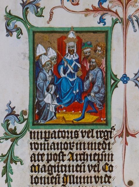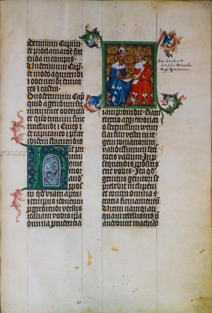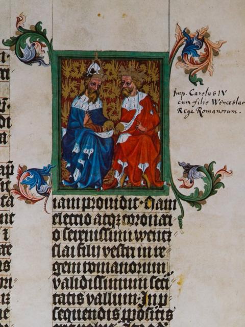 Některé iluminace rukopisu jsou též zajímavé z hlediska panovnické ikonografie. Jen u jedné miniatury máme jistotu, že se jedná o zobrazení krále Václava IV. Jedná se o zcela poslední miniaturu na foliu 53r, kde máme před sebou dvě svorně vedle sebe sedící postavy. Vlevo sedí starší muž s císařskou korunou na hlavě, v levé ruce drží říšské jablko, pravou se poučným gestem obrací na mladšího muže. Mladší muž má na hlavě „pouze“ královskou korunu, v pravici drží královské jablko, levačkou pak komunikuje se svým spolusedícím. Mladým panovníkem je Václav IV., císařem pak jeho otec Karel IV. Ve 2. polovině 17. století byla k miniatuře připsána poznámka: Imperator Carolus IV cum filio Wenceslao Rege Romanorum.