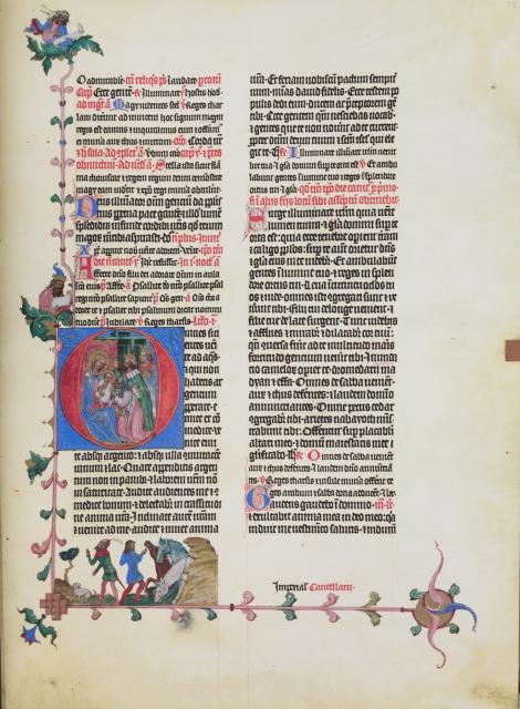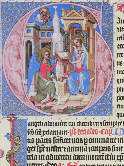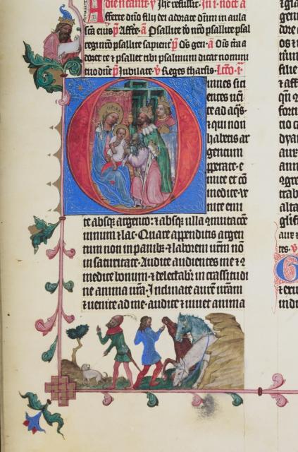 Stranou nemůžeme ponechat ani osobitá vyobrazení v dolních bordurách, která doprovázejí a různým způsobem navazují na velké iniciály. Na počátku žaltáře s králem Davidem adorujícím Krista je to souboj Davida s Goliášem (fol. 9v), u scény Zvěstování jsou to zápasy Samsona se lvem a divého muže s drakem, symbolizující boj dobra se zlem (fol. 69v), u iniciály P s Narozením Krista pak Zvěstování pastýřům (fol. 83v), u Klanění Tří králů postavy z jejich doprovodu (fol. 97r) a u velikonočního výjevu Žen u Kristova hrobu se nachází v dolní borduře starozákonní hostina s beránkem a svěcení velikonočních vajec a pečiva (fol. 145v).
