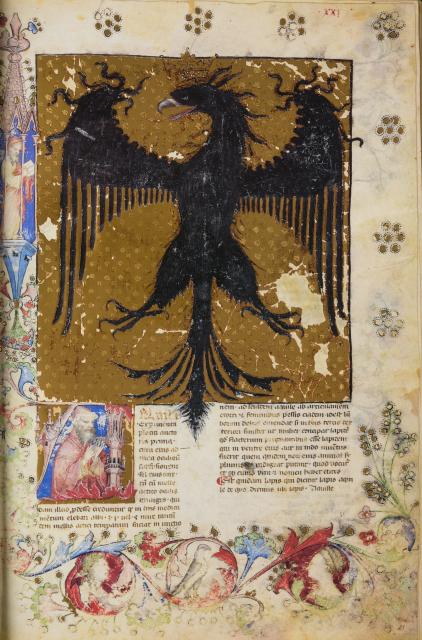 O tom, že rukopis patřil římskému a českému králi Václavu IV., svědčí výzdoba úvodní listu, na němž objevíme reprezentativní Lucemburkovo vyobrazení ve společnosti kurfiřtů. V dolní části listu je namalovaný čtvrcený znak uherského krále Matyáše Korvína. Pod tímto znakem byl ale původně namalovaný znak zcela jiný, jednohlavá orlice bez koruny s roztaženými křídly. Právě díky ní mohl být identifikován panovník vyobrazený na hlavní miniatuře.
