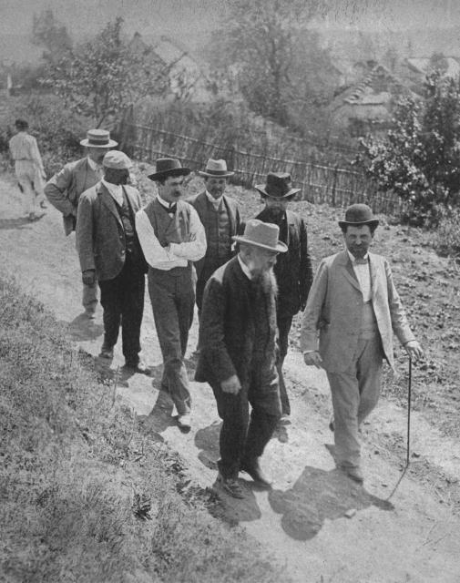 Obr: Rodin s umělci na procházce v Hroznové Lhotě, 2. 6. 1902 (zleva: první dvojice: Auguste Rodin, Alfons Mucha, druhá dvojice: Miloš Jiránek /bez kabátu/ a Josef Mařatka, Joža Uprka za Jiránkem), LA PNP, fond Fotoarchiv, Sbírka negativy, A. Rodin na Moravském Slovácku. Reprodukce z katalogu pražské výstavy.