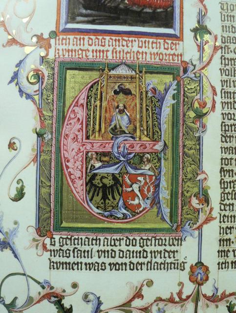 Další zajímavou, reprezentativní iniciálu s vyobrazením českého a římského krále Václava IV. Lucemburského nalezneme ve druhém svazku (Cod. 2760) na foliu 74r. Jejím autorem je opět Frana - František. Touto iniciálou E(s geschach aber...) je uvozena 2. Kniha Samuelova (REGUM II).