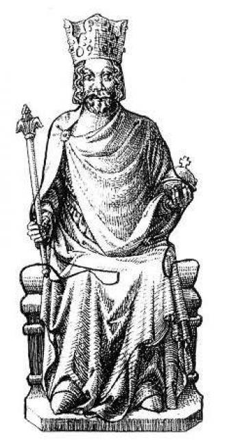 Král sedí na trůnu ve tvaru menzy, na němž je položen polštář. Spodní šat má kulatý výstřih těsně pod krk. Na nohách vidíme špičaté střevíce. Levá ruka je ohnuta téměř v pravém úhlu, je tedy jasné, že něco držela. Pravá ruka byla přitažena více k tělu. Podle gest rukou lze usuzovat, že v pravé ruce držel panovník žezlo a v levé ruce pak královské jablko. Restaurátor a akademický malíř Jiří Blažej sestavil ideální podobu všech čtyř soch a rovněž podobu královské koruny, z níž se dochoval pouze jeden malý zlomek.