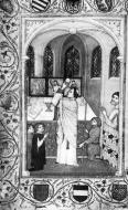 Albrecht je vyobrazen také v mladším melckém exempláři (obr. 2). Na foliu 1v nalezneme téměř totožnou miniaturu jako ve vídeňské modlitební knížce. Rozdíly jsou docela nepatrné, např. v barvě vévodova oděvu. Zajímavější jsou pak erby, jež tvoří výzdobu okrajů daného folia. Nalezneme tam znaky téměř všech zemí, kterým Albrecht Habsburský kolem roku 1438 vládl, tedy i znaky Čech a Moravy.