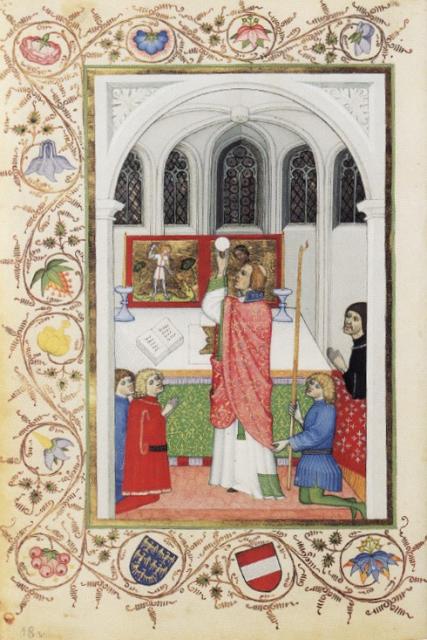 Z hlediska ikonografie Albrechta Habsburského je nejzajímavější celostránková iluminace na foliu 18v (obr. 1). Je na ní vyobrazen vévoda přihlížející mši. Vše je zasazeno do chrámového prostoru. Před oltářem, na němž je vidět retábl s vyobrazeným sv. Jiřím a Bolestným Kristem, stojí kněz, jenž právě pozvedá hostii, což je hlavním „námětem" vyobrazení. Za ním klečí ministrant s hořící svící v pravé ruce, druhou pak přidržuje knězovu kasuli. Po knězově levici pak klečí dva mladí módně odění prosebníci.