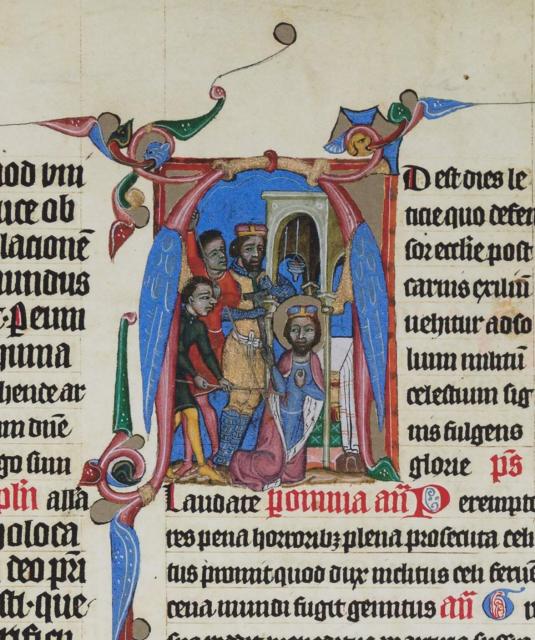 Druhá iniciála se sv. Václavem zdobí folio 313r a opět se jedná o iniciálu A(dest). Zachycena je Václavova mučednická smrt. V iniciále jsou zobrazeny celkem čtyři mužské postavy, z nichž dvě známe i jménem, sv. Václava a jeho mladšího bratra Boleslava. Scéna se odehrává před architekturou, která symbolizuje kostel na (Staré) Boleslavi, před nímž došlo k samotnému incidentu. Svatý Václav klečí v popředí. Je oděn v modrý delší šat, přes ramena má přehozený podobně jako u iniciály folia 268v rudý kožešinou (hermelínem) podšitý plášť, do něhož je částečně zahalen. Na hlavě má knížecí čapku a kolem hlavy svatozář. Pravou rukou s největší pravděpodobností drží čepel meče, kterým na něj zaútočil jeho bratr. Jeho tvář působí klidným dojmem.