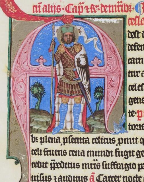 Z hlediska panovnické ikonografie jsou zajímavé dvě iniciály s vypodobněním sv. Václava. Známější iniciálu A(dest) najdeme na foliu 268v. Svatý Václav je zobrazen jako rytíř, což bylo světcovo pojetí, které se ve větší míře začalo objevovat od 13. století. V skalnaté krajině s dvěma stromy stojí rytíř. Rytíř a světec je oblečen v šupinatou zbroj byzantského původu. Zpod zbroje je vidět drátěná košile. Václav je přepásán mečem, v pravé ruce drží korouhev se svatováclavskou orlicí, v levici tříme štít se stejným erbovním znamením. Přes ramena má přehozený kožešinou podšitý plášť, který sahá až na zem. Jeho tvář zdobí vousy na hlavě má knížecí čapku, kolem hlavy svatozář. Podobné vypodobnění můžeme najít kupř. na pečeti Karlovy univerzity.