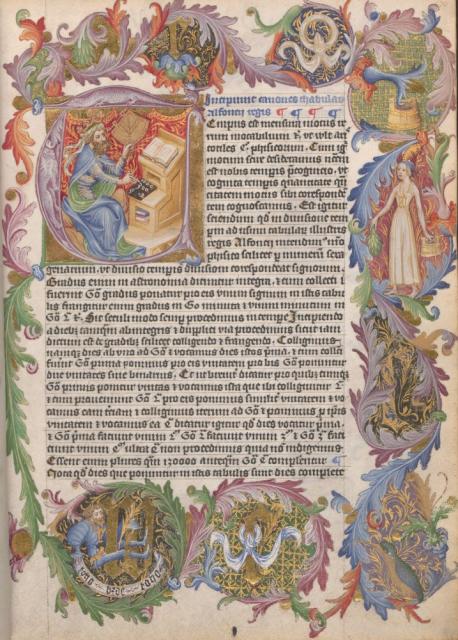 V iniciále T titulního listu Alfonsových tabulek je zobrazen Alfons X., král Kastilie a Leónu (1221-1284) u svého písařského pultu, který zároveň slouží jako odkládací plocha na rukopisy.